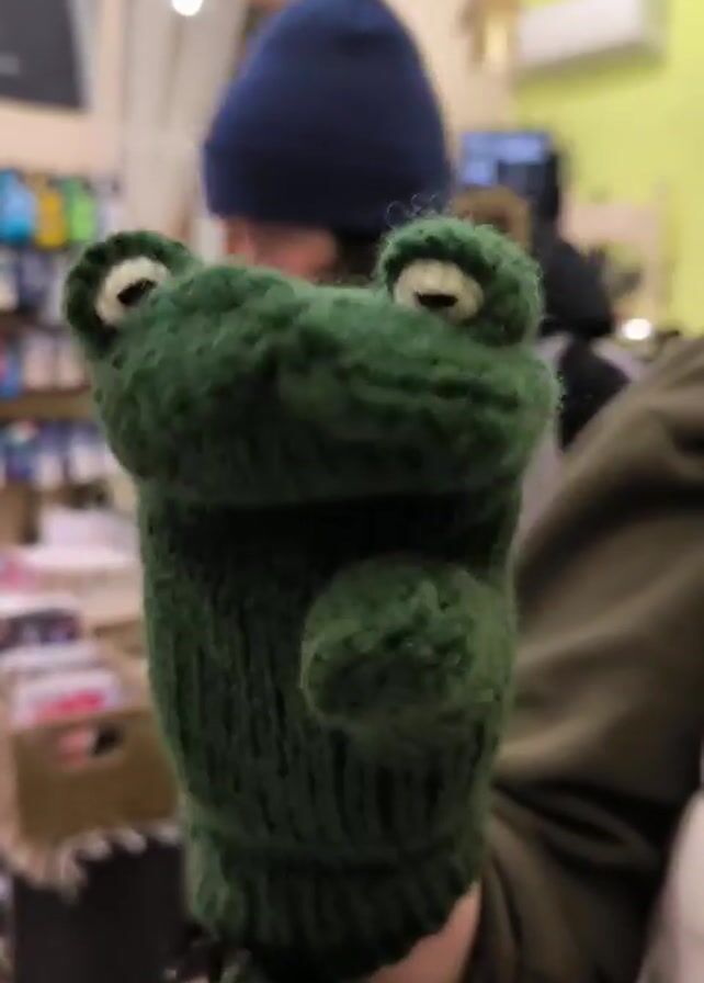 A person is holding up a green knitted frog puppet mitten, in what appears to be an indoor retail environment