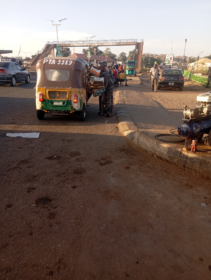 The image depicts a daytime scene on a multi-lane asphalt road in Jos, Nigeria, specifically near the Terminus overhead bridge, identifiable by signage including "TA LADU" on the pedestrian overpass. In the foreground, a brown and green three-wheeled auto-rickshaw, license plate PTA-5519, is parked on the right side of the road. A person, dressed in a patterned garment, stands adjacent to the auto-rickshaw, appearing to manage multiple stacked cardboard boxes and other bundled items. A second individual is partially obscured behind the first, near the vehicle. To the right of the parked auto-rickshaw, on the road's shoulder, a blue engine-driven device resembling an air compressor is positioned. The asphalt road surface exhibits scattered debris and dark stains. A concrete curb separates the main road from the unpaved shoulder. In the mid-ground, a metal pedestrian overpass spans the road. A dark sedan, license plate PTA-2179, moves away from the camera on the left lane. Further down the road on the right, another dark sedan, license plate PTA-5139 partially visible, is parked. Multiple pedestrians are visible on the road and near the overpass structure, including a male figure in a checkered shirt walking on the road. Distant buildings and hilly terrain are visible on the horizon. The ambient lighting suggests either early morning or late afternoon conditions.