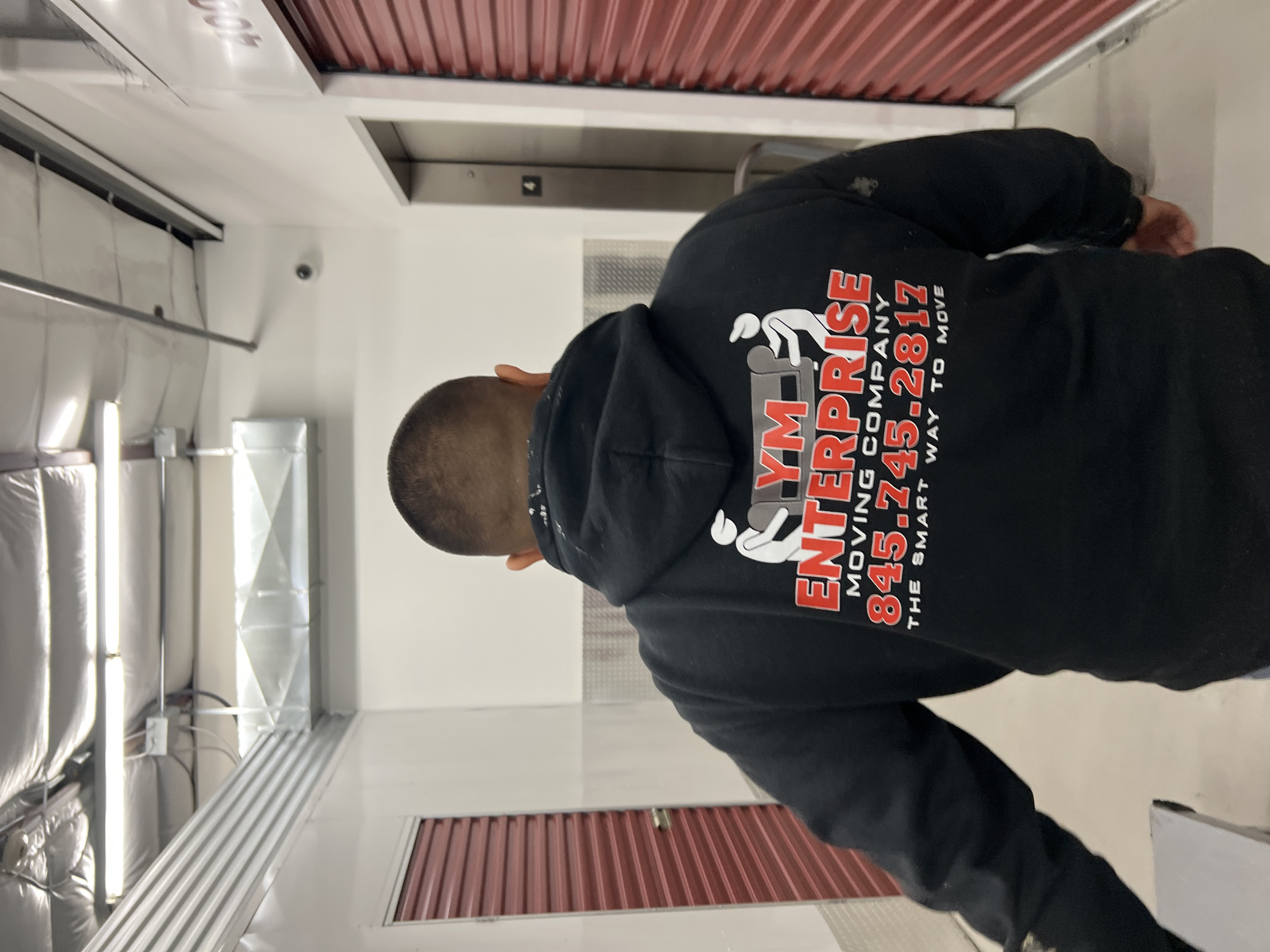 man wearing a black hoodie with the logo of "YM ENTERPRISE MOVING COMPANY 845-745-2817 THE SMART WAY TO MOVE" on the back. He is standing in what appears to be a storage unit facility. The facility has red storage unit doors and white walls. The location is likely in Town of New Windsor, United States of America, based on the area code in the phone number on the hoodie.
