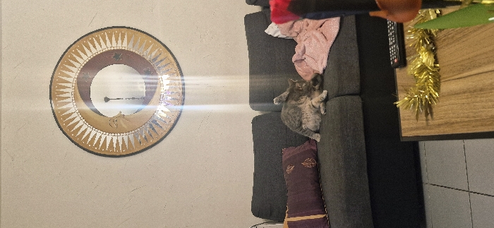 The scene depicts an indoor living space in Rouvroy, France. A gray tabby cat is positioned on a dark gray sofa, actively grooming itself with its left hind leg raised. To the left of the cat, a purple throw pillow with a gold leaf pattern rests on the sofa. To the right, a crumpled pink blanket with white polka dots is partially visible. Mounted on the light-colored wall above the sofa is a circular decorative piece featuring a golden sun motif encompassing a silver crescent moon and a dark central circle. A bright vertical lens flare extends downwards from the center of this wall decor, obscuring a portion of the wall and sofa. In the foreground, the edge of a wooden coffee table with a dark frame is visible. On the table, a black television remote control and a strand of golden tinsel are present. The floor visible beneath the sofa is tiled in a light gray color with dark grout lines.
