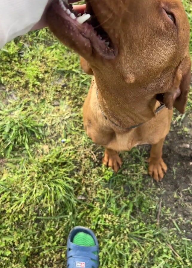 person petting a brown dog on a grassy surface. The person is wearing a white sweatshirt and a blue sandal with a green sock. The dog is on a leash and has a collar. The person is scratching the dog's chin and petting its head. The dog's mouth is slightly open, and it is looking up at the person. The background consists of green grass and some dirt patches.
