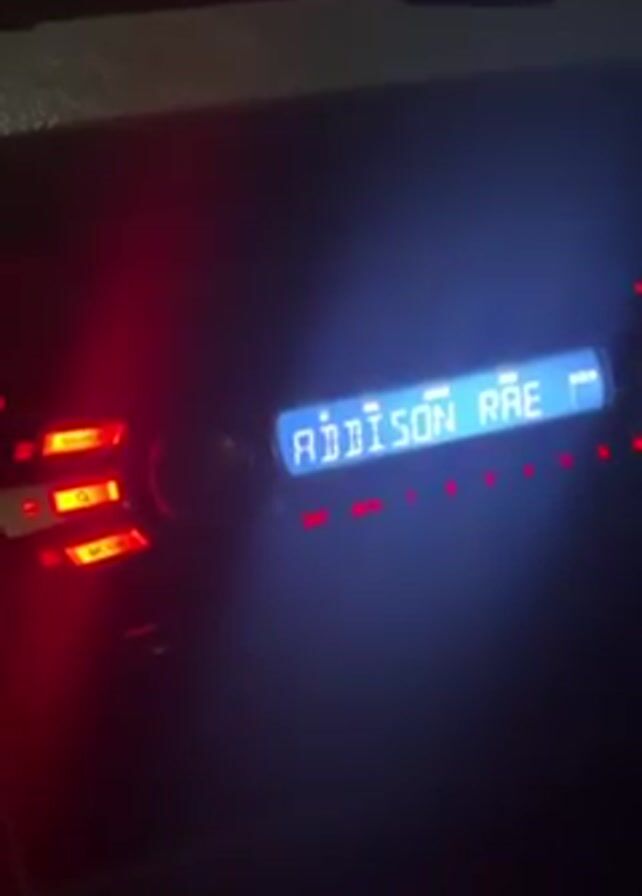 close-up of a car stereo in a dark environment. The stereo display is blue and illuminated, showing the text "ADDISON RAE". Several red lights are also visible on the stereo's buttons and indicators. Music is playing in the background.