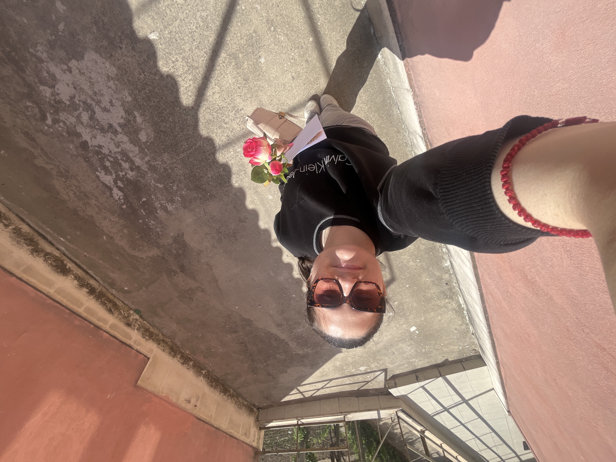 The image is a selfie taken by a woman wearing sunglasses and a black Calvin Klein sweatshirt. She is holding a bouquet of three roses and a light-colored handbag. She also has a red beaded bracelet on her right wrist. The background suggests an outdoor urban environment, featuring a concrete surface, a pink wall, and a view of metal railings. The image was captured in Gotse Delchev, Bulgaria.