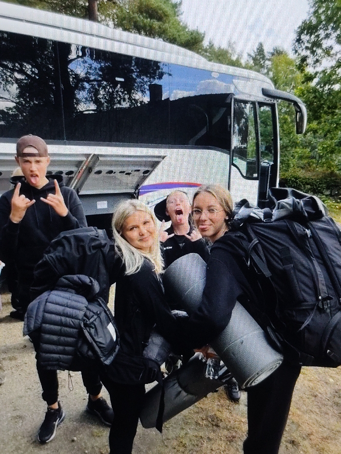 The image captures four young individuals, three female and one male, standing outdoors in front of a grey and white tour bus with its luggage compartments open. The ground is dirt, and the background features green trees under an overcast sky. From left to right: A young male wears a brown baseball cap backward, a black hoodie, and dark pants. He extends his tongue and forms "rock on" hand gestures with both hands. A black backpack with a black puffer jacket attached is visible on his back. Next, a young female with long blonde hair, dressed in a black long-sleeved shirt and dark pants, smiles faintly towards the viewer while holding a grey rolled-up sleeping mat. Adjacent to her, another young female, wearing a dark long-sleeved top, makes a wide-mouthed expression with her tongue extended, her right hand forming a "rock on" gesture. She also holds a grey rolled-up sleeping mat. The rightmost individual is a young female with long light brown hair, wearing eyeglasses, a dark long-sleeved top, and dark pants. She smiles towards the viewer and carries a large black backpack on her back, additionally holding a grey rolled-up sleeping mat. The individuals display playful expressions and gestures, suggesting a casual and interactive pose for the camera. The bus and camping gear indicate a travel or outdoor activity context. The specific location within Charleroi, Belgium, is not discernible from the visual evidence presented in the image, which depicts a generic outdoor setting with a bus and trees.