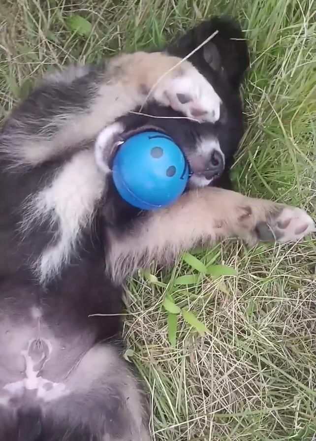 - "A small black and white puppy rolls in the grass, playing with a blue ball" by FM-qWfSK2, licensed under CC BY 4.0