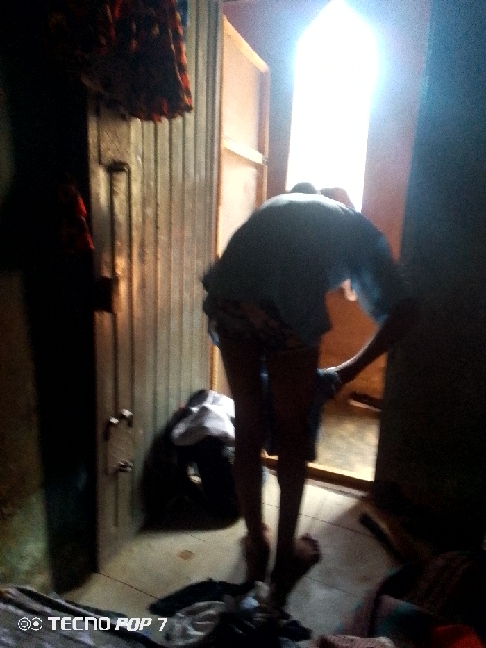 Inside a dimly lit room, a person wearing shorts and a light-colored shirt bends over, facing an open doorway that is filled with bright light. An open sliding door is visible on the left. A bag is on the floor next to it. Clothes are scattered on the floor. The scene is captured with a "Tecno Pop 7" watermark at the bottom left corner.