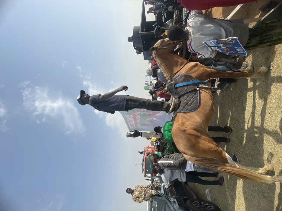 At an outdoor event under a bright sky, a man in a dark shirt and cap stands on a horse. The horse is equipped with a saddle. Crowds gather, some holding signs and a person poses. Other vehicles and people are visible in the background.