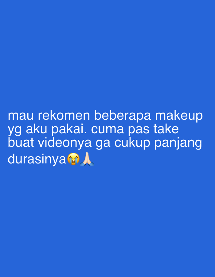 The image displays a solid blue background with white text centered horizontally. The text is in Indonesian and reads: "mau rekomen beberapa makeup yg aku pakai. cuma pas take buat videonya ga cukup panjang durasinya 😭🙏". This translates to: "I want to recommend some makeup that I use. It's just that when I recorded the video, the duration wasn't long enough 😭🙏". The text is accompanied by a "crying face" emoji and a "folded hands" emoji. The scene is a digital graphic composed solely of text and emojis on a colored field; it does not depict any physical environment, people, objects, actions, or interactions. No specific location within the city of Bekasi, Indonesia, or any other geographical point, is discernible from the image content.