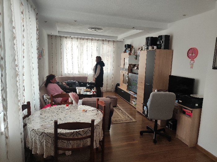 The image depicts the interior of a residential living space in Kulata, Bulgaria, functioning as a combined living and dining area. Three individuals are present. To the left, a round wooden dining table draped with a white lace tablecloth is surrounded by at least three wooden chairs. Behind the dining table, a woman wearing a light pink long-sleeved top and dark trousers is seated on a light-colored sofa, looking towards the left. Another individual, partially obscured and reclined, is also on the sofa. A dark-haired woman, wearing a dark vest over a lighter top, stands upright near the sofa, facing the seated woman. A coffee table in front of the sofa holds various items, including food and beverages. The floor is hardwood, partially covered by a patterned area rug. Along the right wall, a large media console composed of dark and light wood panels features a television screen and is topped with speakers and decorative items. Adjacent to this unit, a light wood desk holds a computer monitor and a printer, with a gray rolling office chair positioned in front of it. A pink decorative clock is affixed to the wall above the desk. Windows along the back and left walls are covered with patterned white curtains. The walls are white, and the ceiling features multiple levels and recessed lighting.