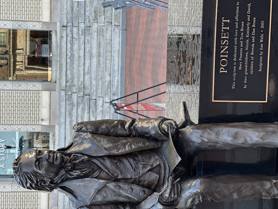 A bronze statue of Joel Roberts Poinsett sits in front of a building. The statue depicts a seated man in a coat, holding a paper. Behind the statue is a black plaque that reads "POINSETT" and dedicates the sculpture to Mary Frances and Tom Bruce by their grandchildren. It identifies Zan Wells as the sculptor and dates the work to 2001. A sign with the words "A STORY" is visible in the reflection of a window in the background.