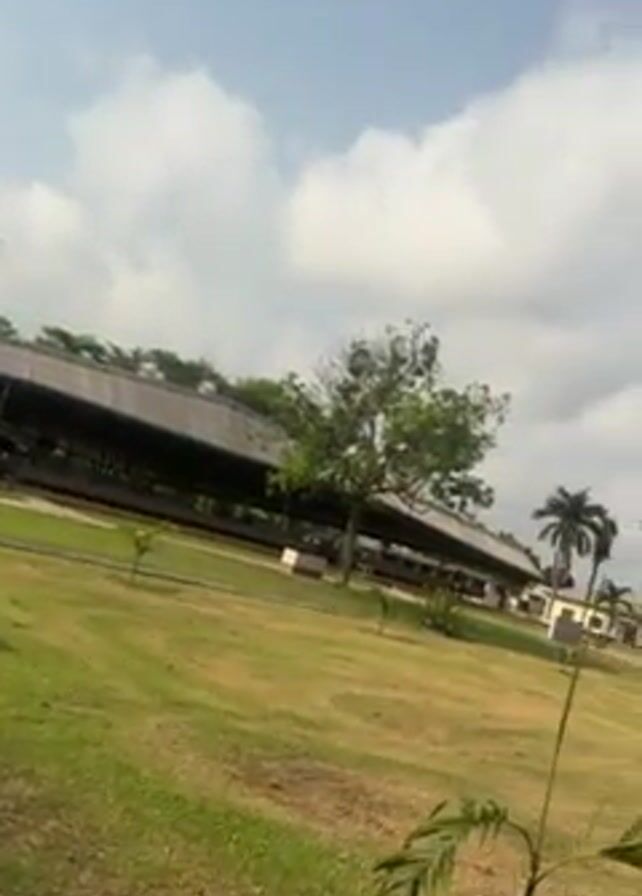 sunny day at an outdoor location with well-maintained green grass, trees, and a long, covered walkway or building structure