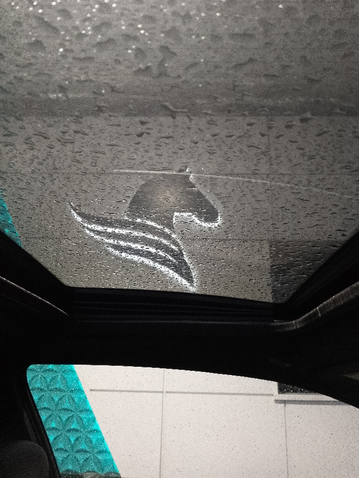 - "The image depicts an upward view from inside a vehicle, primarily through its panoramic sunroof, during conditions involving water, likely rain or a car wash" by FM-zDkzX2, licensed under CC BY 4.0