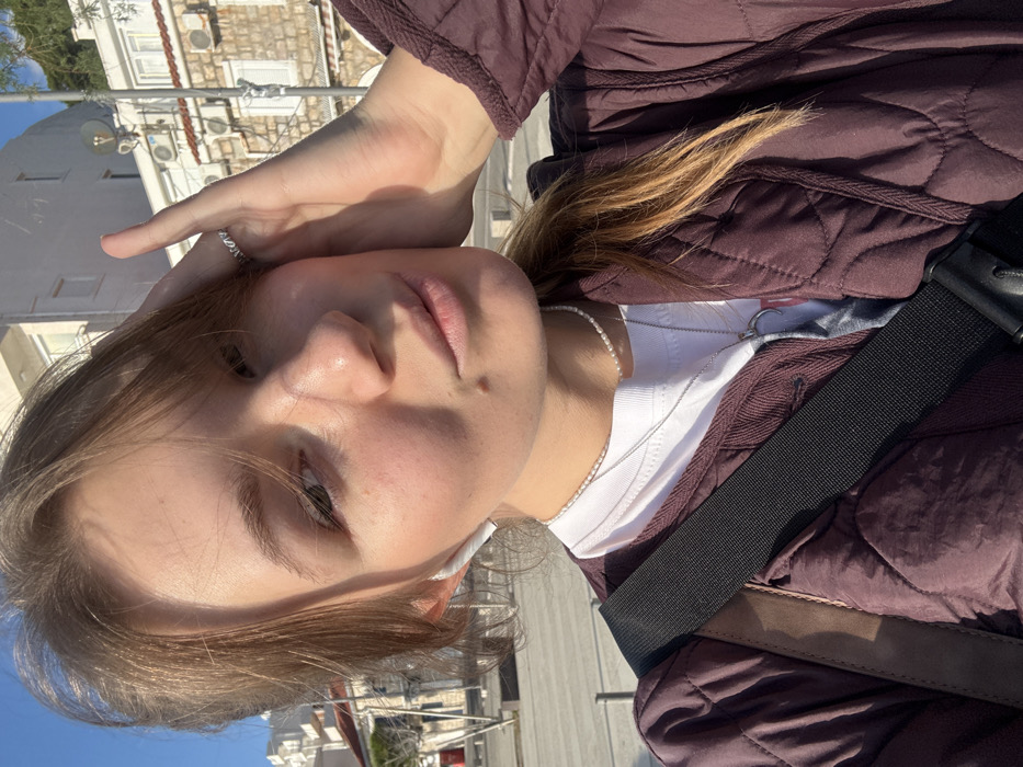 The image displays a young female subject in an outdoor setting in Sutomore, Montenegro