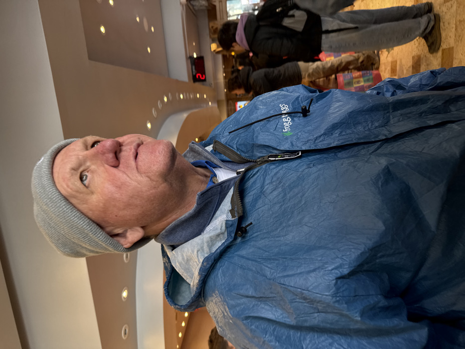 An older Caucasian man wearing a gray beanie and blue rain jacket looks upwards. Behind him, people stand in a queue, one wearing a black jacket and gray pants. Overhead, recessed lighting fixtures line a curved ceiling. A digital display with the number "2" is visible. The background is slightly blurred, suggesting a shallow depth of field.
