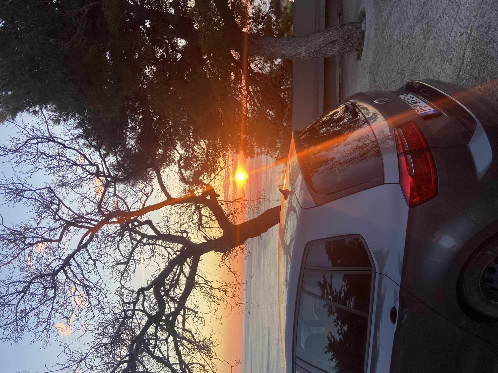 The image captures a sunset scene in Donji Katun, Montenegro. A dark grey Volkswagen hatchback is parked on a textured paved surface, positioned with its rear angled towards the viewer, its Montenegrin license plate "PG MV652" partially visible. The setting sun, a vivid orange disc, is positioned low on the horizon above a calm body of water, generating significant lens flare and strong orange reflections on the car's rear window and body panels. The sky transitions from a light blue overhead to bright orange and yellow hues at the horizon, featuring sparse, illuminated clouds. Two trees frame the sunset: a bare, deciduous tree with complex, dark branches is on the left, and a dense, dark green coniferous tree stands on the right. No individuals, specific actions, or interactions are discernible.