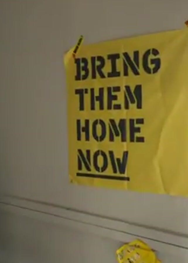 room with a yellow sign on the wall that reads "BRING THEM HOME NOW" in black stenciled letters