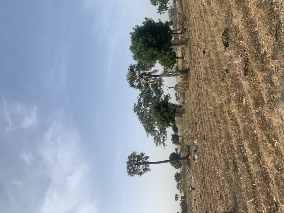 A landscape view showcases a clear blue sky with wisps of clouds. Sparse trees dot a dry, cultivated field, distinguished by rows of furrows. Palm trees stand out amongst the broader-leafed trees. Dispersed debris litters the ground.