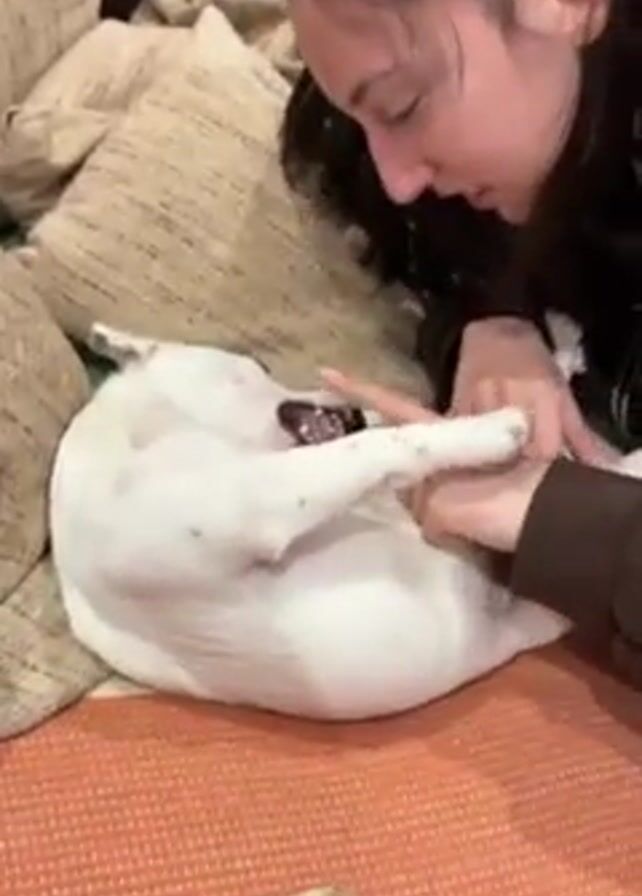 A young woman is lying on a brown couch next to a white dog with black spots. She is holding the dog and touching its mouth. The dog opens its mouth, showing its teeth.