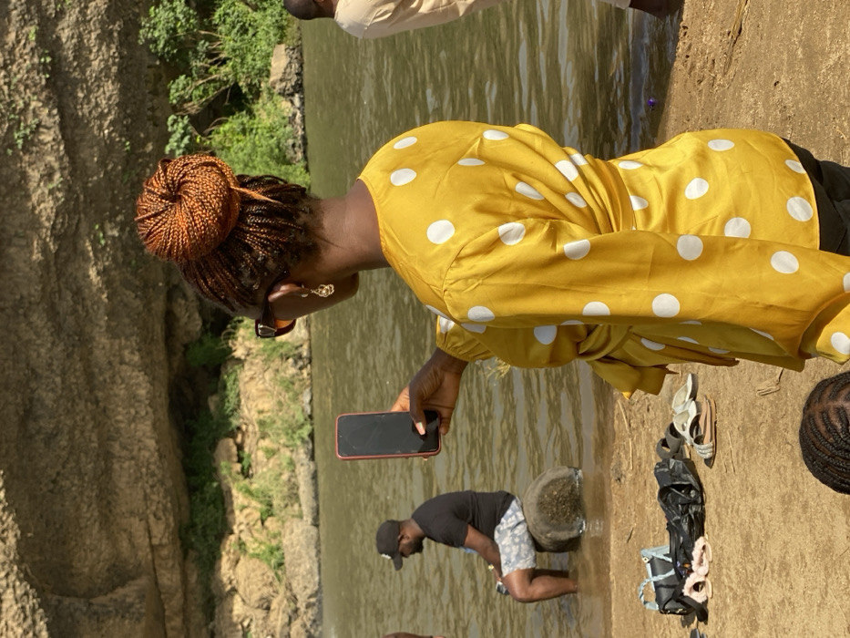 The image depicts an outdoor scene at a body of water in Kukum, Nigeria. In the foreground, a woman, viewed from behind and slightly to the right, has dark skin, orange-brown braided hair styled in a high bun, and wears a long-sleeved yellow blouse with white polka dots. She also wears sunglasses on her head and a gold-colored earring. Her right hand holds a red-cased smartphone in a vertical orientation, as if recording or photographing. To the left, further back in the murky green-brown water, a man is seated on a dark, cylindrical rock or log, wearing a black t-shirt, patterned shorts, and a black baseball cap; his lower legs are submerged. A third individual is partially visible on the far right, standing at the water's edge. On the light brown sandy bank in the lower left, a black bag, a light blue bag, and multiple pairs of sandals are visible. The background consists of large, weathered light brown rock formations along the far bank, partially covered by green vegetation.