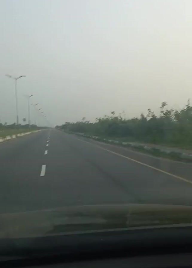 view from inside a vehicle driving on a straight, multi-lane highway. The highway is lined with street lights. On either side of the road, there is vegetation, including bushes and some banana trees. The sky is overcast, creating a foggy or hazy atmosphere. The dashboard of the vehicle is visible at the bottom of the frame.