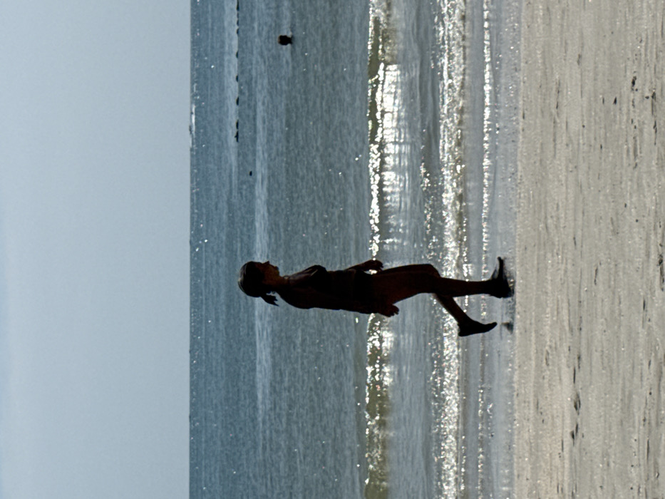 A silhouette of a woman on a beach. She is standing close to the water's edge, and her body is oriented from left to right in the frame. The sun glimmers on the sea behind her. A dark object floats distantly in the water. The beach, sand, and sea take up the bottom, middle, and top of the frame, respectively. The image is rotated, causing the sky to appear on the left side.