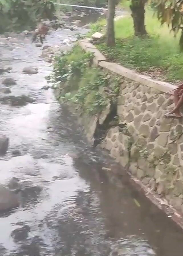 A person sits on a stone wall above a stream, and then an older person fishes in the stream. The stream is surrounded by lush vegetation and rocks. The stone wall shows signs of damage. Debris litters the stream.