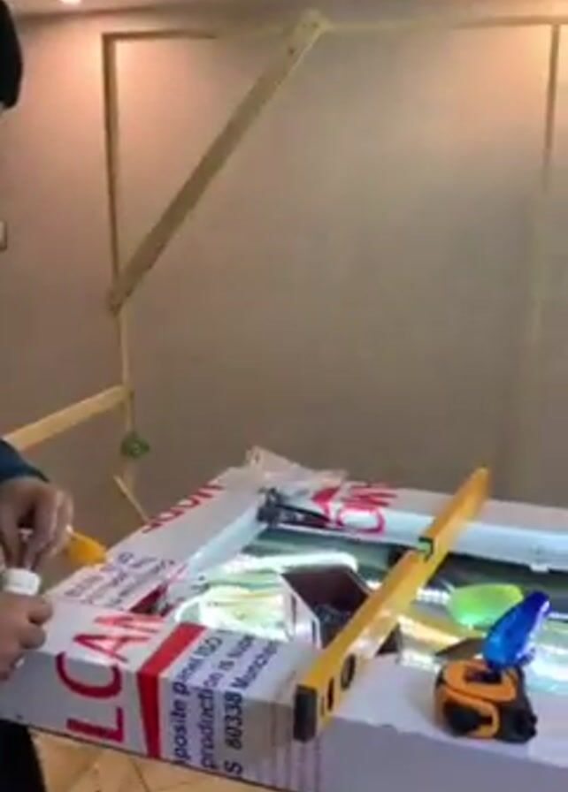 A man with a beard wearing a beanie and vest is working on a long, rectangular object on a table. The object appears to be made of white composite panels with red and white lettering that says "LOCAN composite panel SE production is Munich S 80338 Wunderlich." The object is lit up with LED lights, and the man seems to be connecting or adjusting the wiring. Tools such as a level, a tape measure, and a blue pen are on the table. The room is decorated with neutral-colored wallpaper and recessed lighting, and electrical wiring is exposed on the wall.