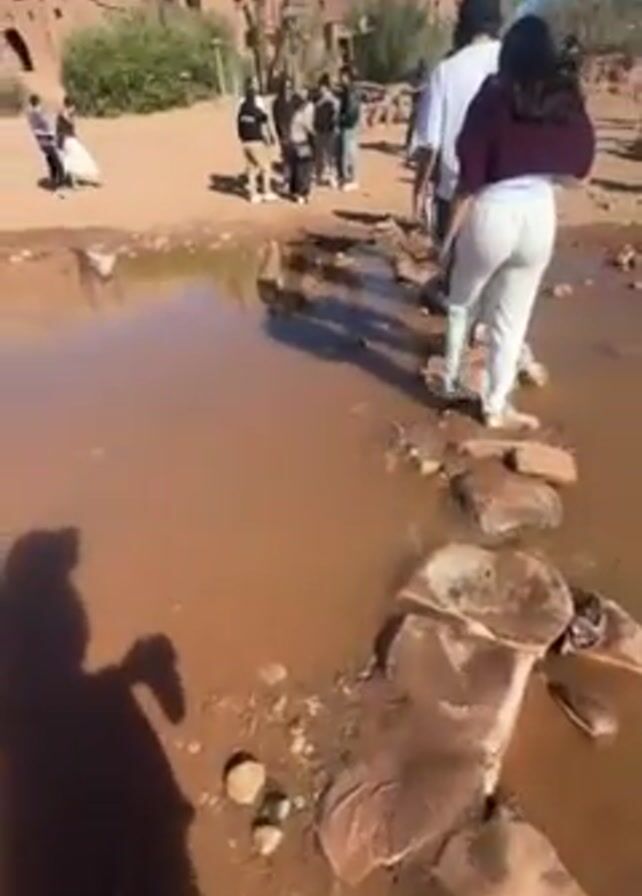 A person is walking across a small body of reddish-brown water, stepping on rocks. A group of people is ahead of them, some standing by the water and some walking on the rocks. A building, potentially made of mud bricks, is visible in the background on a hill. The sky is blue. The camera then focuses on the surface of the water, showing the shadows of two people.