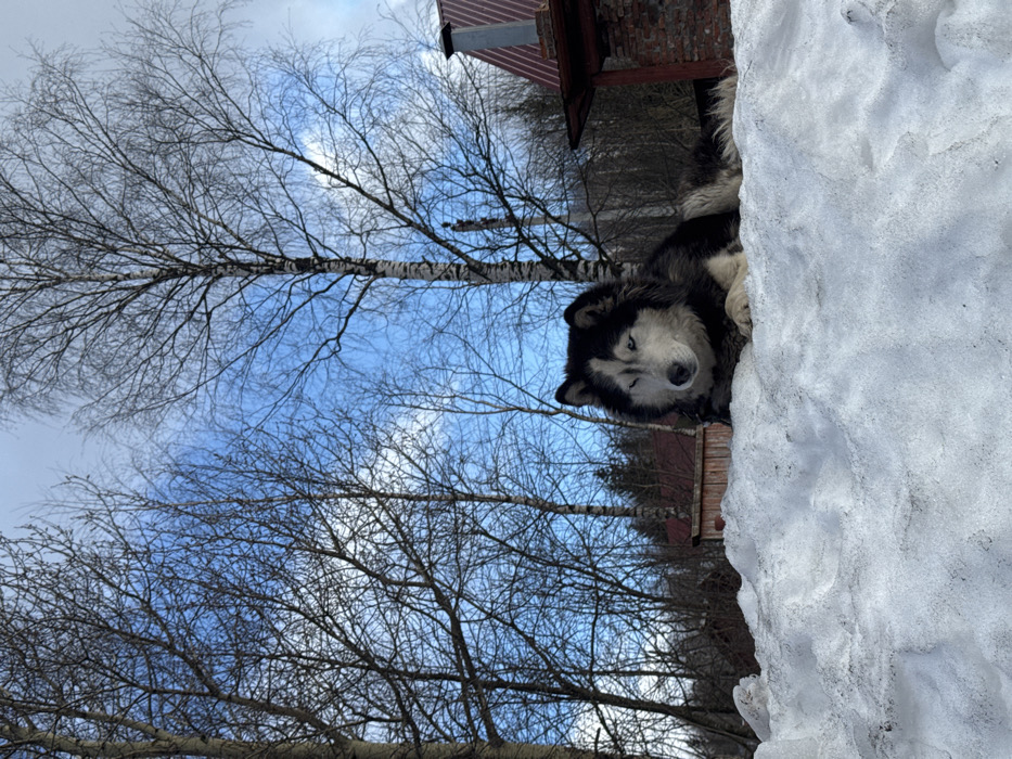 - "A husky-type dog with black and white fur and blue eyes is positioned in the center-right of the frame, lying on a substantial snowdrift" by FM-L48Wm1, licensed under CC BY 4.0