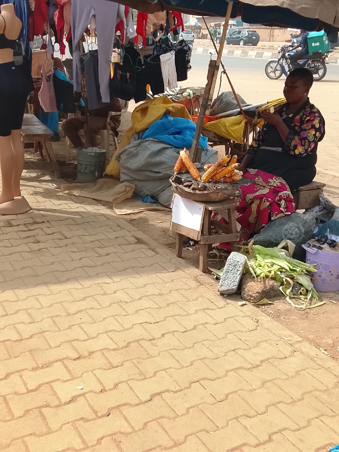 A street-side vendor sits on a small stool under a makeshift awning, selling grilled corn on the cob. A bowl full of grilled corn sits on a smaller stool in front of her. Behind her are piles of cloth and clothing. A motorbike passes on a road behind the vendor. To the vendor's right are husks and a bucket, next to the paving. The paving is tan-colored and made of interlocking bricks.