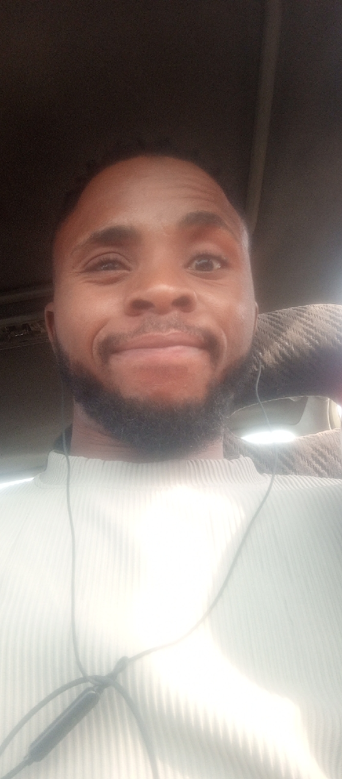 An indoor setting, likely within a vehicle, in the city of Unknown, Unknown. The image displays a frontal, close-up view of one adult male subject with dark skin, a dark beard, and short dark hair. He wears a light-colored, ribbed turtleneck garment. Black wired earphones are visible around his neck, with a control module resting on his chest. The subject is looking directly at the camera, exhibiting a slight facial expression consistent with a smile or smirk. The background is predominantly dark and indistinct above the subject's head, with a textured, patterned surface (possibly upholstery) visible to the upper right. A strong light source illuminates the lower central portion of the frame, brightening the subject's shirt. No other individuals or discernible activities are present.