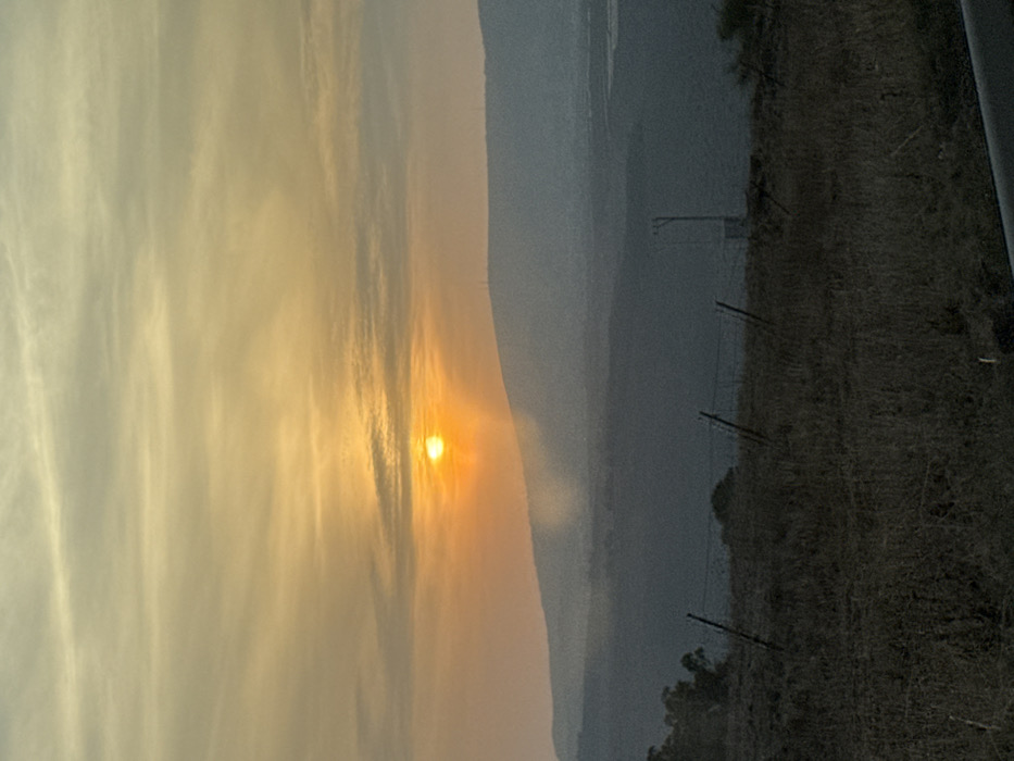 An outdoor landscape photograph taken in the Golan Regional Council, Israel, depicts either a sunset or sunrise over a mountainous terrain. The upper two-thirds of the image features a sky with warm orange, yellow, and pale grey hues. The bright orange-yellow sun is positioned slightly left of center, low above a range of hazy, dark hills that form the midground. Distinct crepuscular rays extend downwards from the sun, visibly interacting with a localized plume of light-colored smoke or fog situated on a midground hill. The foreground consists of a dry, uncultivated field covered in brown, sparse vegetation. Three dark, irregularly spaced fence posts are visible, angled along a line extending from the mid-left towards the center-right. A dark utility pole or similar upright structure stands in the right mid-foreground. Faint structures, possibly communication towers, are discernible on distant hilltops. The bottom edge of the frame shows a dark, indistinct horizontal obstruction, suggesting the image was captured from inside a vehicle.