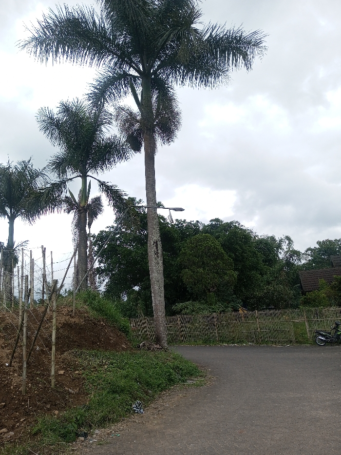 Tall palm trees stand against a cloudy sky. A wooden fence stretches along a road, with a parked motorbike visible behind it. An embankment with sparse vegetation and bamboo supports rises on the left. A street lamp is attached to one of the palms. The scene appears to be rural or suburban, with a mix of natural and man-made elements.