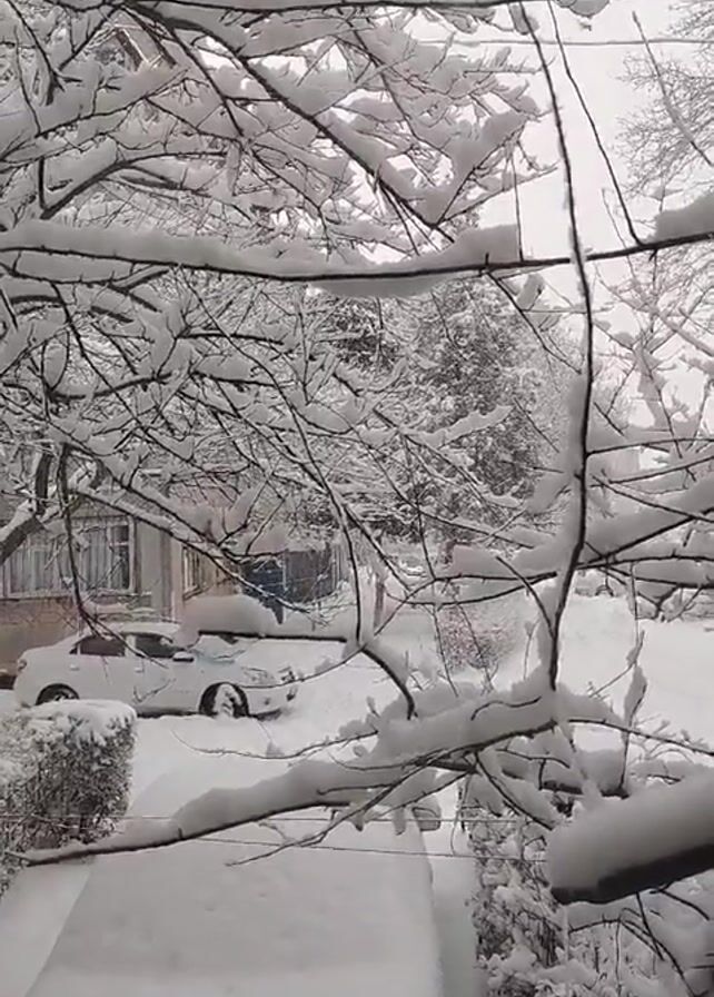 The view from a window shows a thick layer of snow blanketing the surrounding landscape, including trees, bushes, cars, and a building