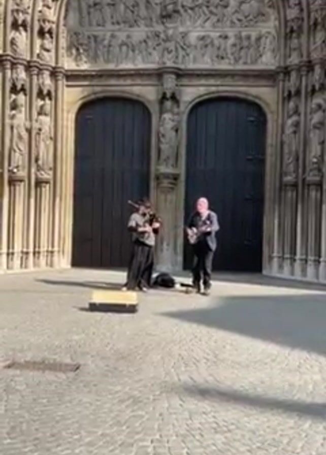 Two musicians perform on a cobblestone plaza in front of an ornately carved church doorway