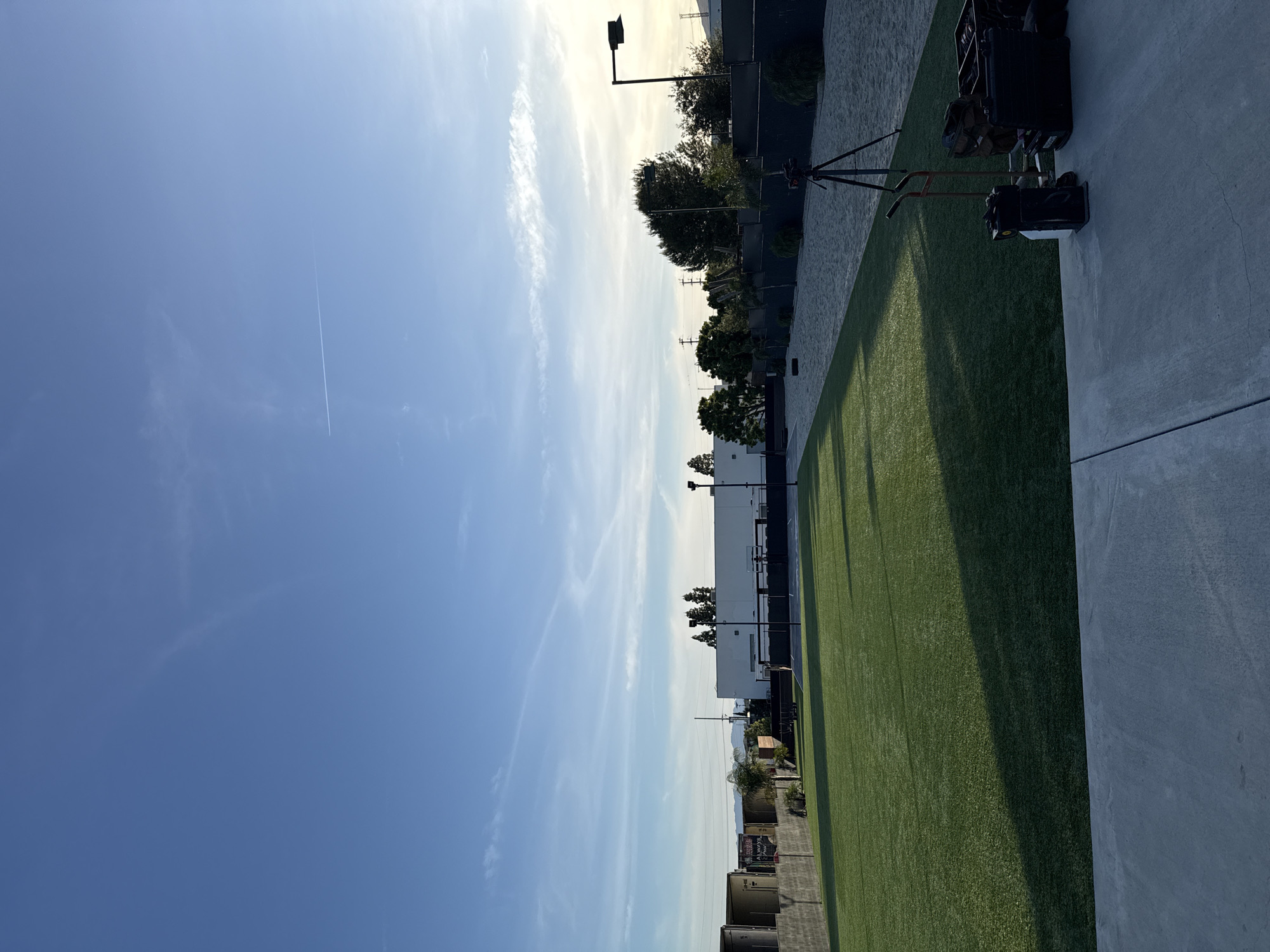 n outdoor scene on a clear day. A green artificial turf field occupies a significant portion of the right side. A concrete surface borders the field. An object resembling film equipment is partially visible in the upper-right corner. Beyond the field, there's a line of trees, utility poles, and structures. A building with a white facade is also visible in the distance. The sky is predominantly blue with streaks of white clouds. A contrail from a jet is visible in the upper left quadrant of the frame. Specific buildings, businesses, or individuals cannot be identified. The location is suspected to be in the city of Los Angeles, United States of America.