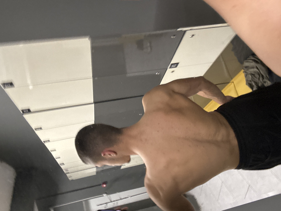The image depicts a male individual standing shirtless, facing away from the camera, displaying his muscular back in what appears to be a locker room