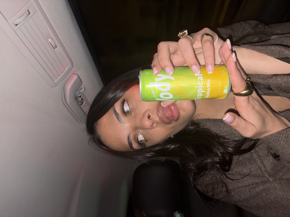 A brunette woman with large eyes and a puckered mouth holds a can of Cody’s Tropical Vodka Mix. She wears a brown, textured coat and several gold rings, including one that is large and ornate. The scene appears to be inside a car, indicated by the ceiling and seat visible in the background. The image is slightly tilted.
