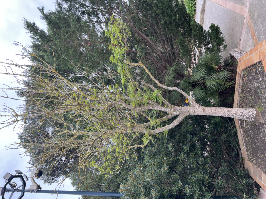 The scene depicts an urban green space in Manacor, Spain, under an overcast sky. A deciduous tree, approximately 3-4 meters in height, occupies a central position within a raised, hexagonal plant bed bordered by terracotta tiles and filled with dark soil. The tree's bark is light grey and mottled, with numerous upper branches devoid of leaves but covered in light green and yellow lichen. New, bright green foliage is emerging on the lower and mid-sections of the branches. Behind the central tree, a dense arrangement of dark green coniferous trees and various bushes forms the background. A small palm tree with fan-shaped fronds is partially visible beneath the main tree's canopy. To the right of the plant bed, a concrete pathway featuring embedded terracotta tile patterns extends. On the far left, a tall grey utility pole supports multiple rectangular floodlights and a white dome-shaped security camera, which is oriented generally towards the right. A small, brightly colored object, yellow and blue, is partially obscured at the base of the central tree's trunk. No individuals are present, and no discernible actions or interactions are occurring.