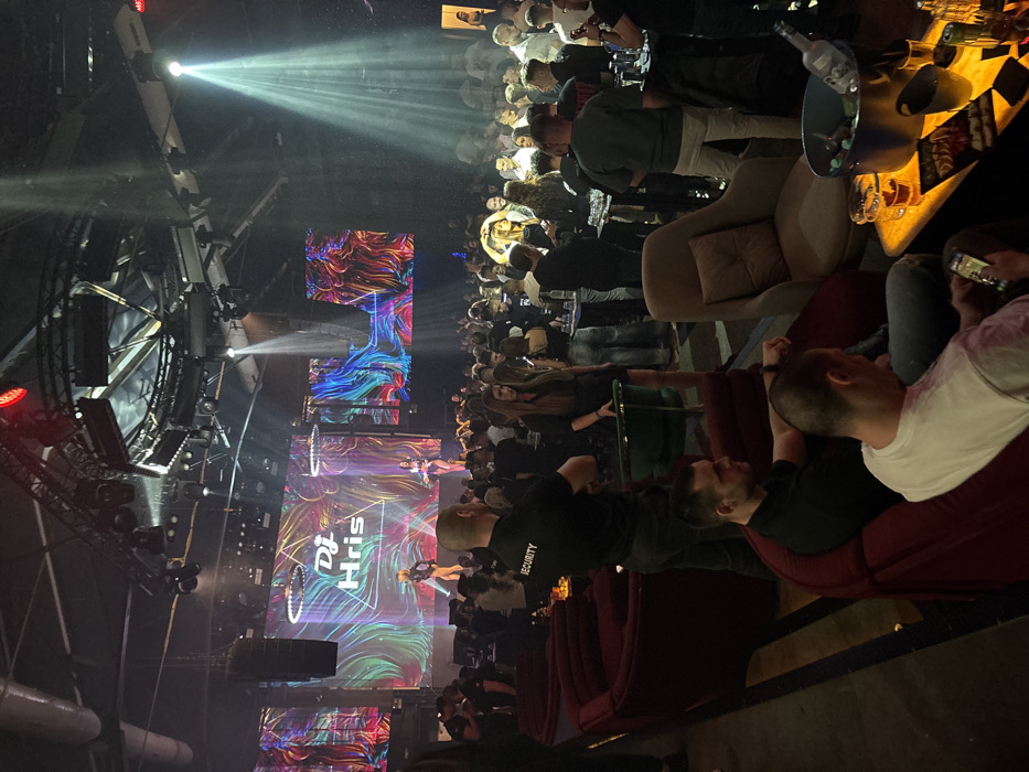 The image depicts the interior of a crowded nightclub or entertainment venue located in Burgas, Bulgaria. The high ceiling features exposed metal trussing supporting multiple stage lighting fixtures, including spotlights, wash lights, and red accent lights. At the rear of the venue, an elevated stage is present, backed by three large LED screens displaying "DJ Hris" in white text within a triangular graphic, flanked by abstract, colorful patterns. Two female performers in dark, minimal stage attire are visible on the stage, one on the left and one on the right. A large number of patrons, primarily adults, occupy the main floor area, standing and interacting, mostly facing the stage. A strong, vertical white spotlight beam illuminates the air on the right side of the venue. In the foreground and mid-ground, lounge seating areas are arranged. These include curved, red velvet-upholstered sofas and individual upholstered armchairs in a light brown/beige color. A male security guard, wearing a black t-shirt with "SECURITY" printed on the back, stands with his back to the camera in the mid-ground, observing the crowd. In the immediate foreground, two males are seated on a red sofa. One male, wearing a black t-shirt, is seated further back, looking to the right. Another male, wearing a white t-shirt, is seated closer to the camera, looking down at a smartphone in his hands. On an illuminated table in front of them, an ice bucket contains an Absolut Vodka bottle and other drinks. Glasses and a menu or promotional leaflet are also present on the table.