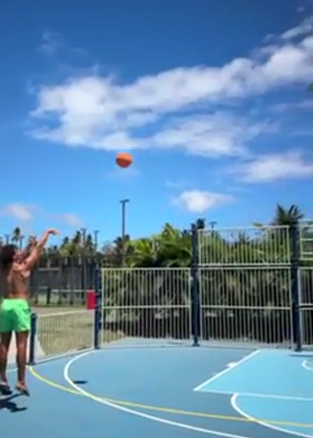 A short video shot outdoors on a sunny day shows a person playing basketball
