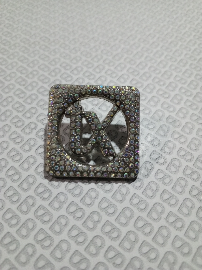 A square-shaped metallic ornament, adorned with numerous small, iridescent rhinestones, is positioned centrally on a light grey or white textured surface. The ornament features a raised, intertwined, stylized design resembling the letters "TV" or "TX" within its perimeter, also completely encrusted with the same type of rhinestones. The surrounding background surface exhibits a repetitive, embossed pattern of interlocking "B" shapes. The item casts a subtle shadow to its lower right. There are no individuals, actions, or interactions depicted.