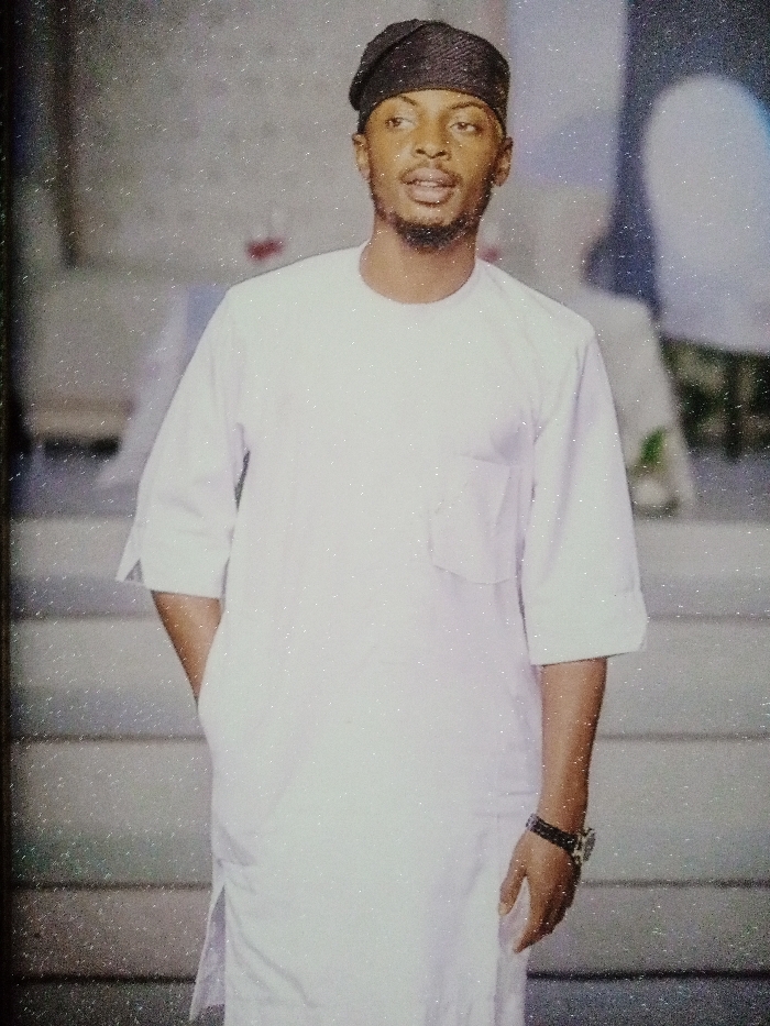 An adult male stands facing slightly right of the viewer, looking forward, in what appears to be an indoor setting. He has a dark complexion, short dark hair, and a short beard. He is wearing a light-colored, possibly white, traditional tunic with short sleeves and a single breast pocket on the left side. A dark, possibly black, traditional cap is on his head. A dark-strapped wristwatch with a metallic face is visible on his left wrist. His left hand is in the pocket of his tunic. The background is significantly blurred, showing indistinct shapes and muted colors, suggesting an event space or gathering, with what might be horizontal paneling or a patterned wall. The floor is light-colored. The entire image exhibits a visible sparkling or grainy texture. The specific location within Jos, Nigeria, cannot be determined from the visual information presented.