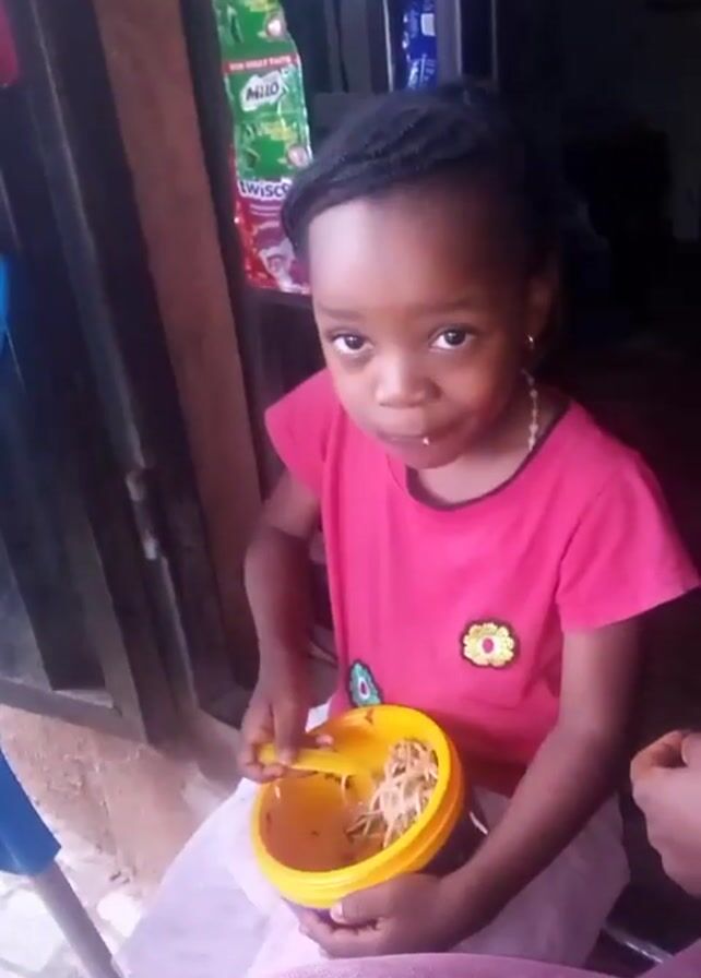 A young Black girl, likely between 3 and 5 years old, is sitting and eating noodles from a yellow bowl with a matching yellow fork. She is wearing a bright pink t-shirt with a flower-like patch on it and a white skirt or dress. Her hair is styled in neat braids, partly gathered at the top of her head. She takes a large bite of noodles and looks directly at the camera. Behind her, on a shelf, are various food items, including packages of Milo and Wisco. The background appears to be the entryway of a shop, with a metal gate partially visible. A person's lap, covered in purple fabric, is visible to the right of the frame.