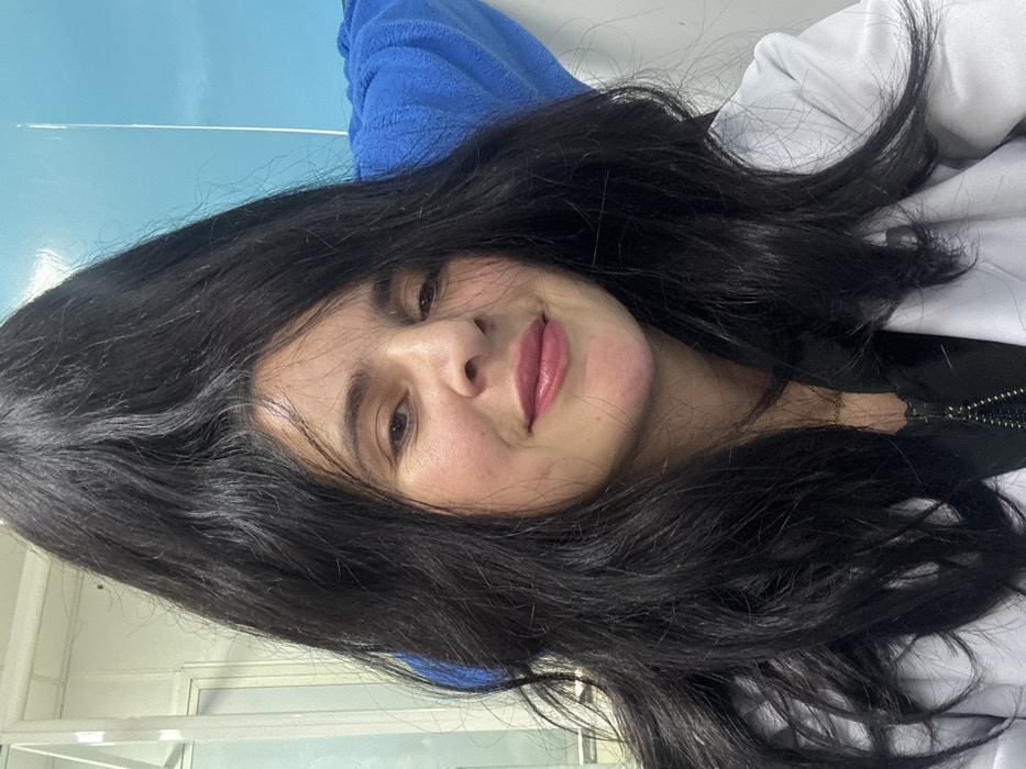 A woman is depicted in a close-up, frontal shot, situated in the city of Meknes, Morocco. She has long, dark hair styled with significant volume, appearing conical at the crown and flowing around her shoulders and face, with some strands falling across her forehead. Her face shows a slight smile, with pink lipstick applied to her lips. She is wearing a white lab coat over a dark garment that features a zipper and a visible pendant. The background to her left consists of light-colored, indistinct architectural elements, likely part of an interior structure. To her right, a bright blue surface is visible, partially obscured by a textured blue fabric object, and a thin white vertical line runs along the blue surface. The lighting is even, suggesting an indoor environment.