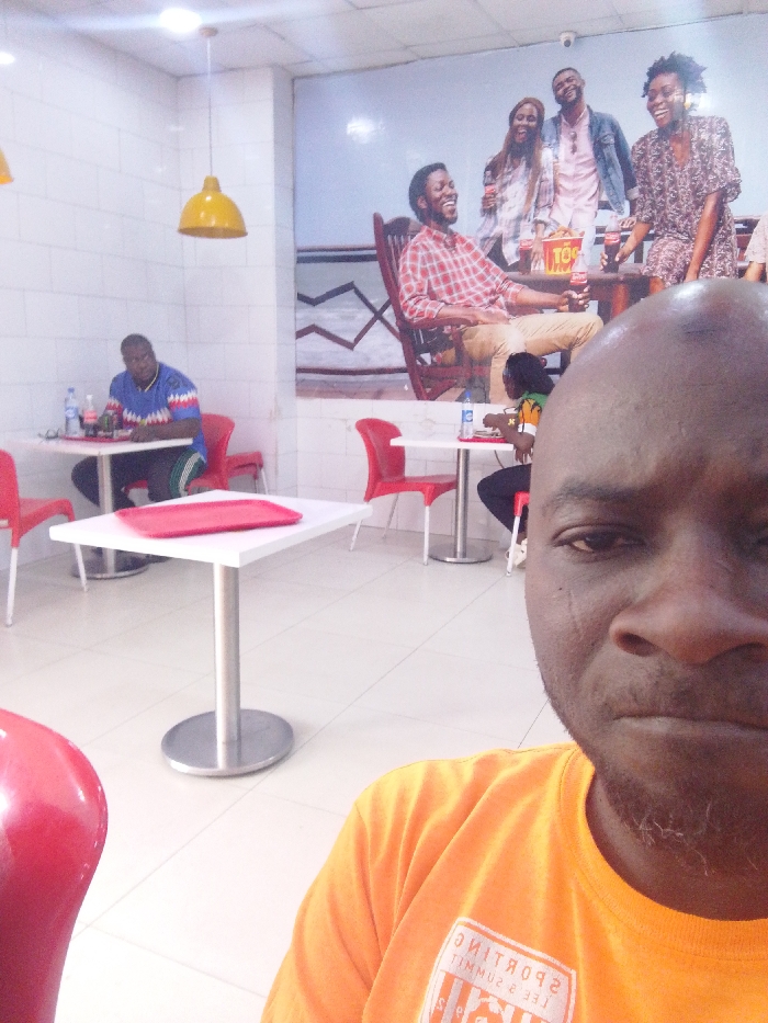 An indoor photograph depicts a casual dining establishment in Giginyu, Nigeria. The foreground is occupied by a partial selfie of an adult male with dark skin, dark stubble, and a distinct scar near his right eye. He wears an orange t-shirt with a white, inverted graphic print and looks directly at the camera with a neutral expression. The environment features light-colored tiled flooring and white tiled walls, illuminated by overhead fluorescent lighting and two yellow bell-shaped pendant lamps. In the mid-ground, two patrons are seated at separate white square tables with silver pedestal bases, utilizing red plastic chairs. To the left, a dark-skinned male in a blue, white, and red patterned shirt and dark trousers with green and white striped cuffs is observed looking down at his table, where a Coca-Cola bottle, a water bottle, and a dark, unidentified object are present. To the right, another dark-skinned individual with dark hair, wearing a striped top, is seated at a table containing beverages and a plate. The background wall features a large mural portraying five smiling Black individuals socializing around a table laden with Coca-Cola products and a "TOP" branded bucket of fried chicken.