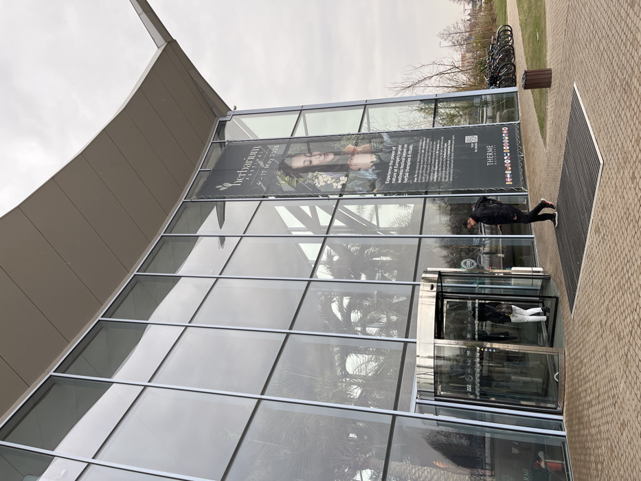 The image displays the exterior of the Therme București building in Săftica, Romania, under an overcast sky. The structure features a modern glass facade with multiple vertical and horizontal panes, topped by a curved, light-colored overhanging roof. Reflections of interior palm trees and the grey sky are visible on the glass. A large, dark vertical banner is affixed to the facade's right side, advertising the "HERBARIUM FESTIVAL" from "4 - 17 MAY 2026," with a graphic of a woman and text detailing "Europe's largest wellness festival." At the ground level, a silver-framed revolving glass door serves as an entrance on the left. A person wearing a dark jacket and white pants is partially visible, entering this door. To the right of the door, a dark grey rectangular doormat is situated on light brown paved ground. A second individual, male, wearing a dark jacket, dark pants, and shoes with red soles, is walking across this doormat from left to right, looking down at a handheld device. Further to the right, a dark brown cylindrical waste bin stands next to a row of parked bicycles on a patch of grass. Distant bare trees and minimal structures are visible in the background on the right.