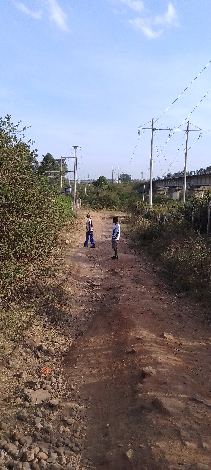 A dirt road stretches towards a bridge with power lines overhead. Two young people stand on the path. The person on the left wears long blue pants and a light shirt. The person on the right has on shorts and a white shirt. Lush green bushes and trees line the road. The sky is blue with scattered clouds.
