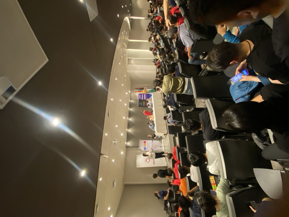 A large crowd of people is seated in rows of chairs facing a stage. The stage has a white table with flags behind it. A person is speaking at a podium with a banner. Some people in the audience are looking at their phones. The lighting in the room is dim, with bright lights illuminating the stage. The room has a curved ceiling and walls.