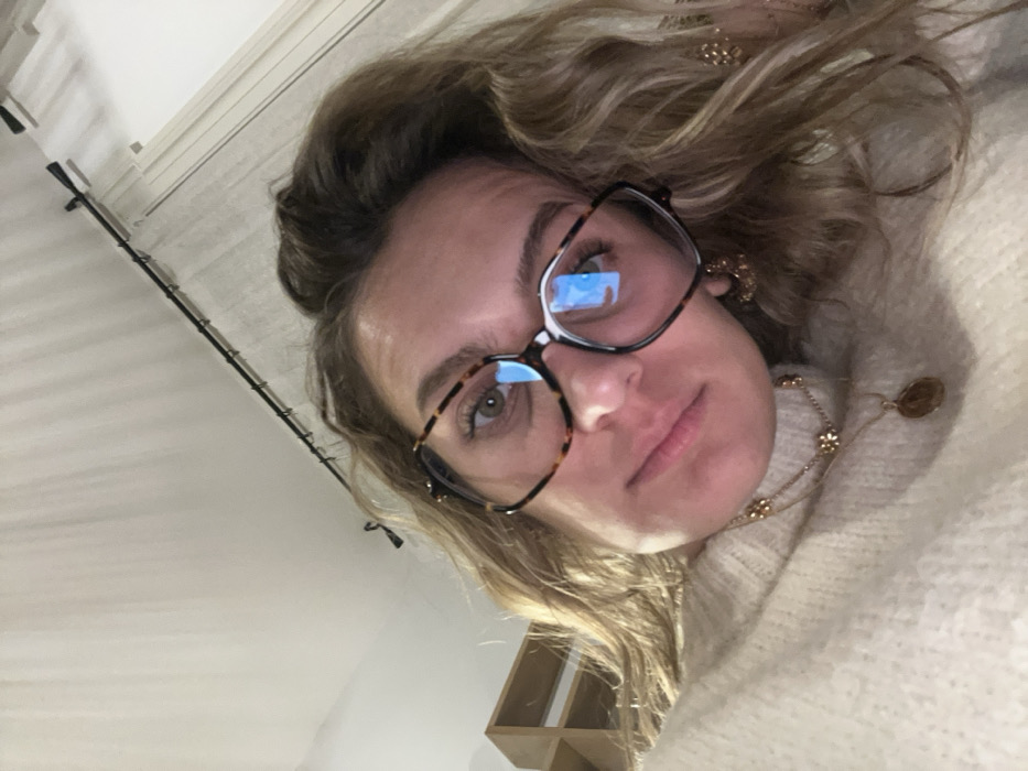 A woman with blonde, wavy hair wearing oversized glasses. Her sweater is a cream color and has a high neckline. She is wearing gold jewelry, including a necklace and earrings. The background is a white wall with a black curtain rod. A wooden shelf is visible in the bottom right corner. The photo is taken from a low angle, looking up at the woman.